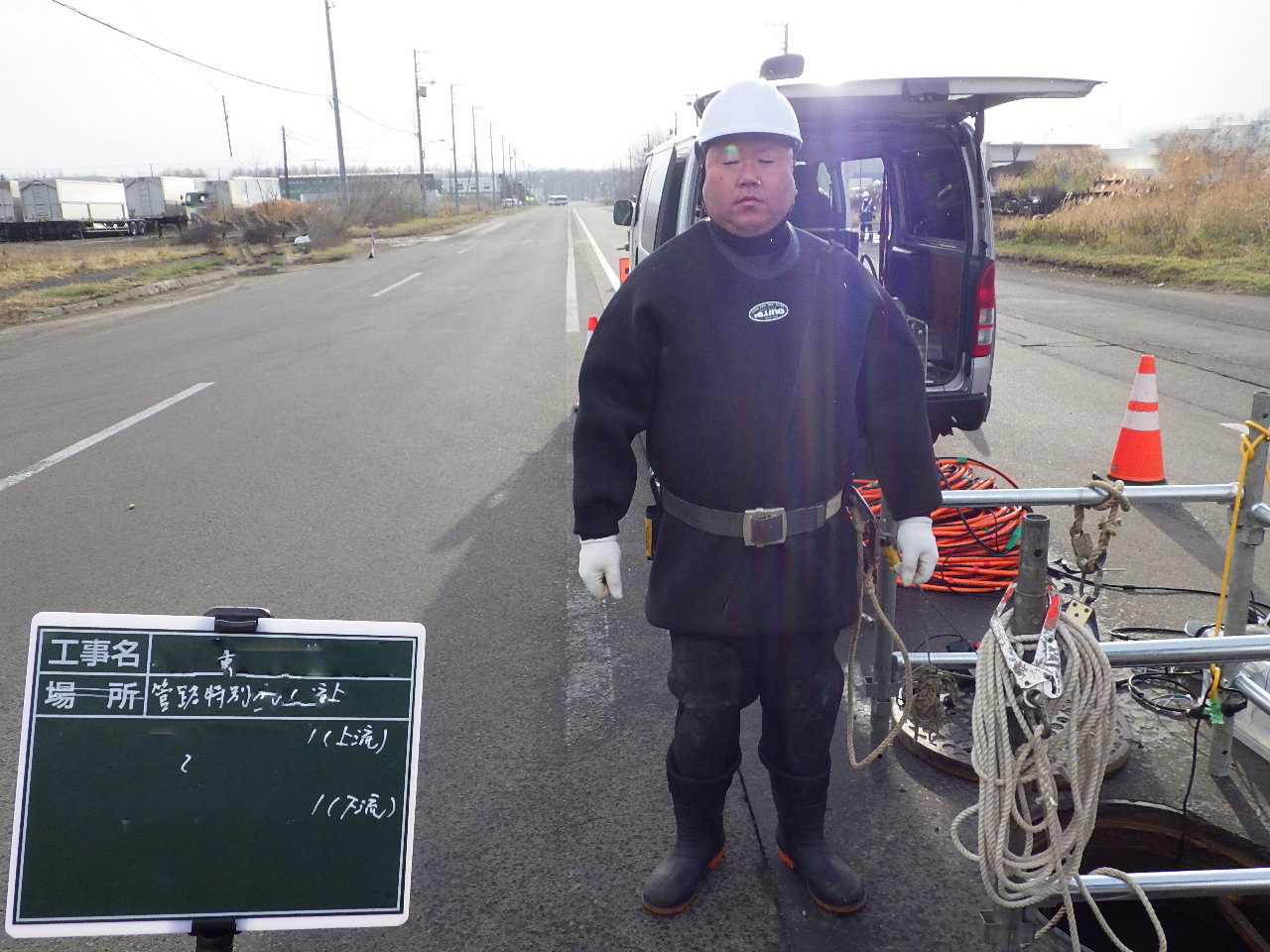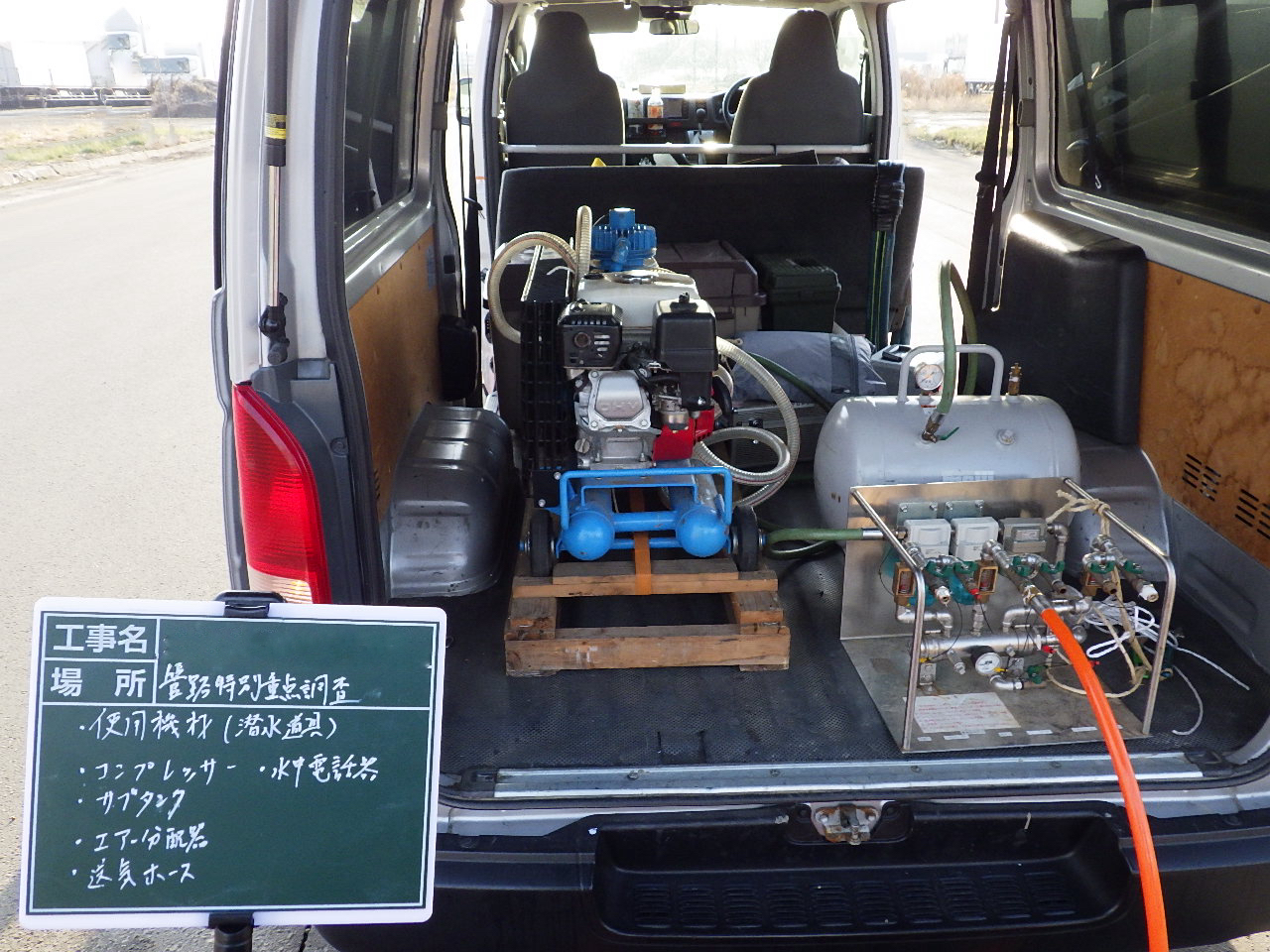 硫化水素対策とし、検知器を使用すると共に、万が一の安全対策とし送気式器具を装備した潜水士が下水管に入り管路の継目、亀裂の映像を撮影を行いました。