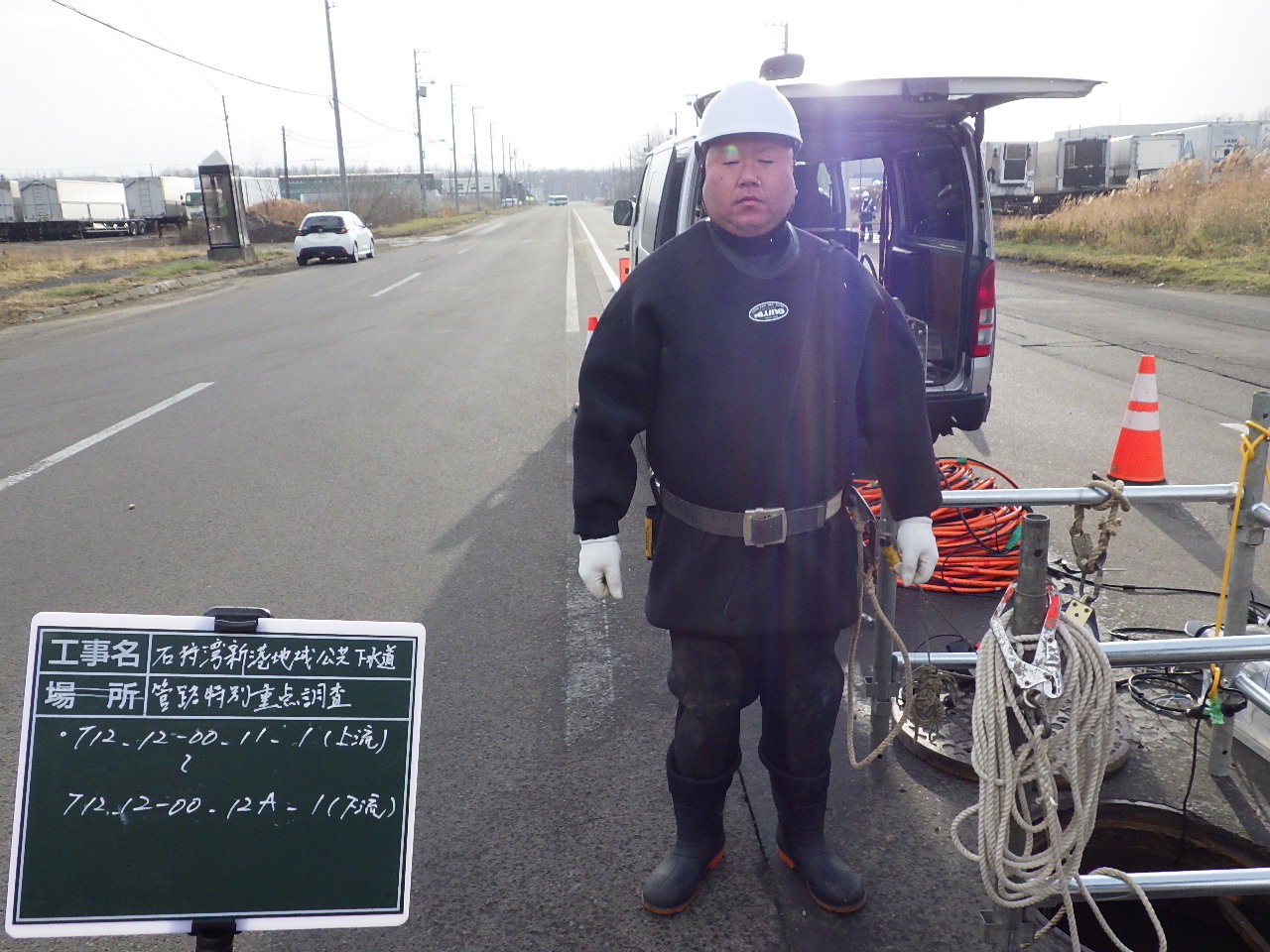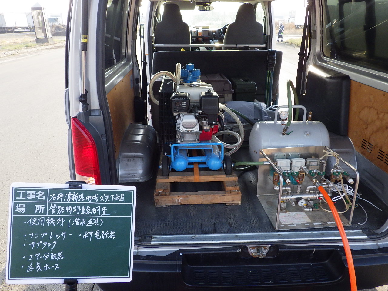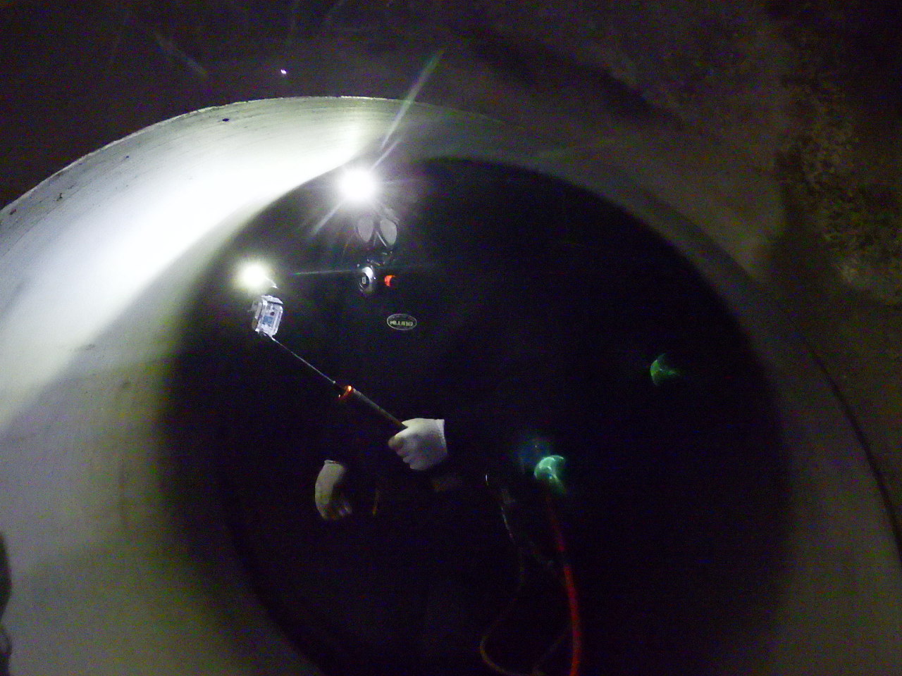 硫化水素対策とし、検知器を使用すると共に、万が一の安全対策とし送気式器具を装備した潜水士が下水管に入り管路の継目、亀裂の映像を撮影を行いました。
